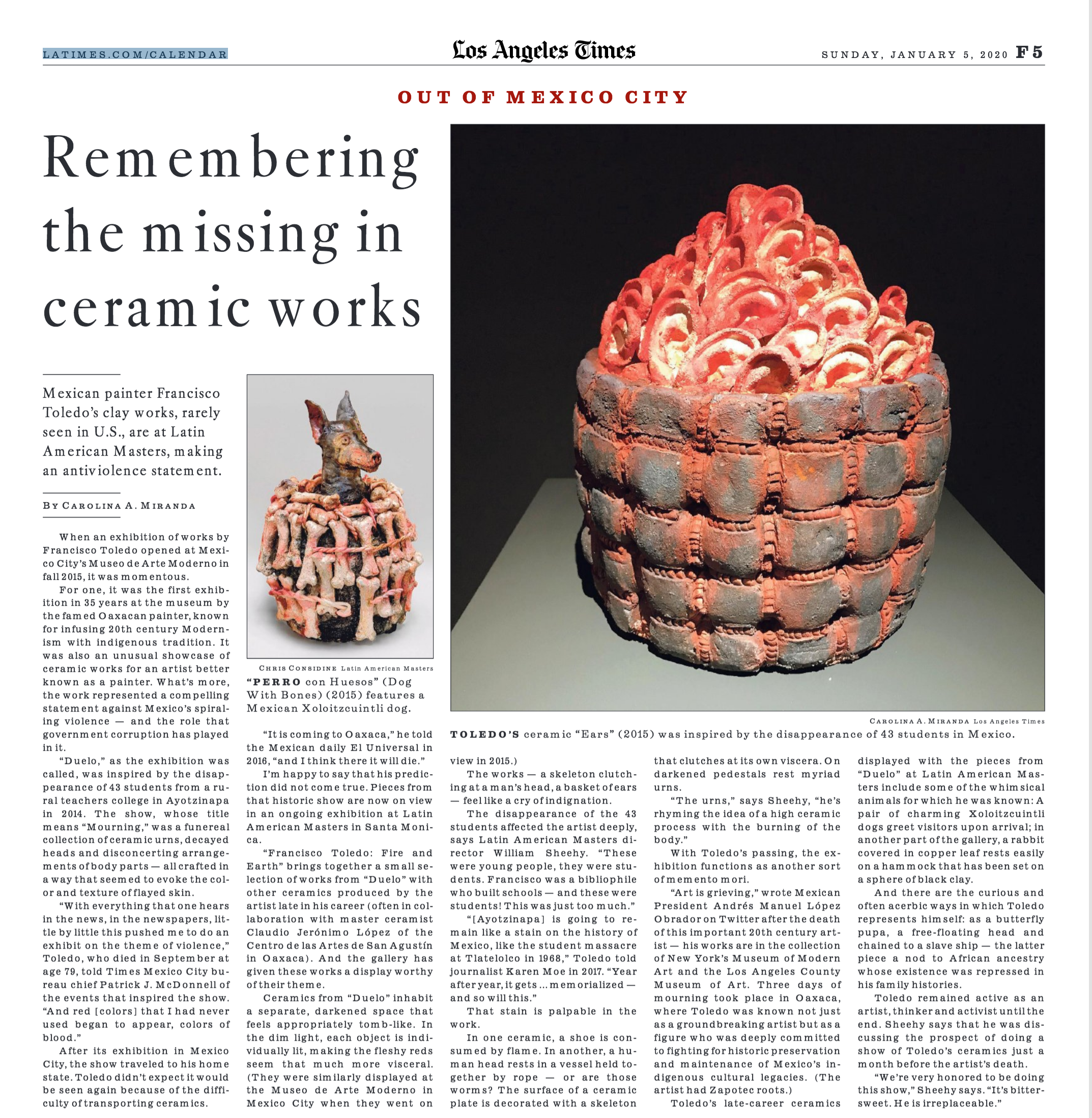 For one, it was the first exhibition in 35 years at the museum by the famed Oaxacan painter, who is known for infusing 20th century Modernism with indigenous tradition. It was also an unusual showcase of ceramic works for an artist better known as a painter. What’s more, the work represented a compelling statement against Mexico’s spiraling violence — and the role that government corruption has played in it.
